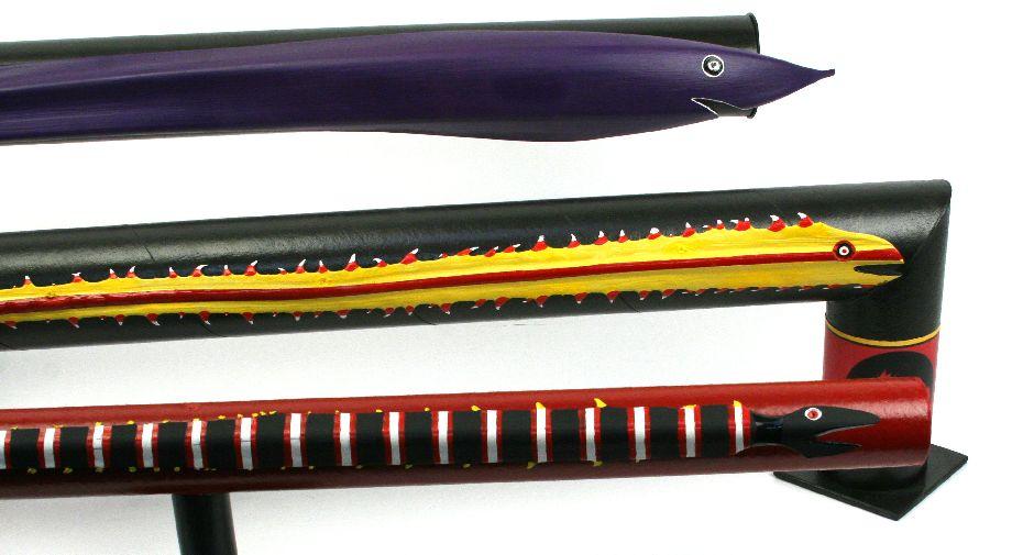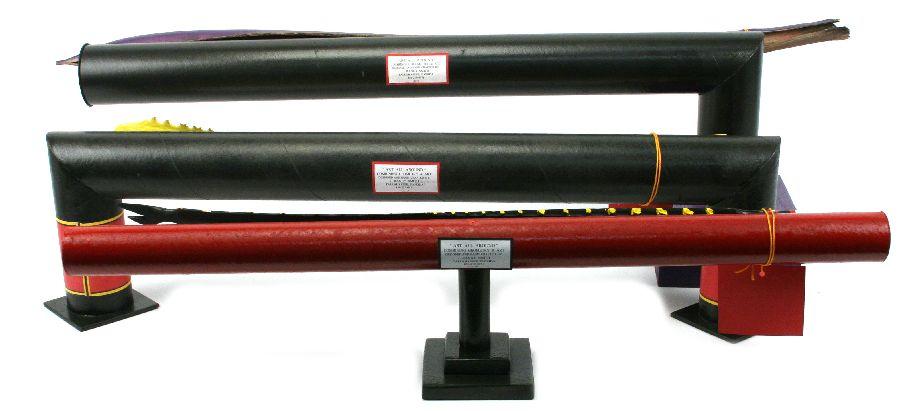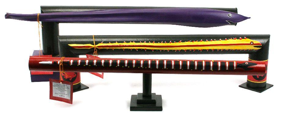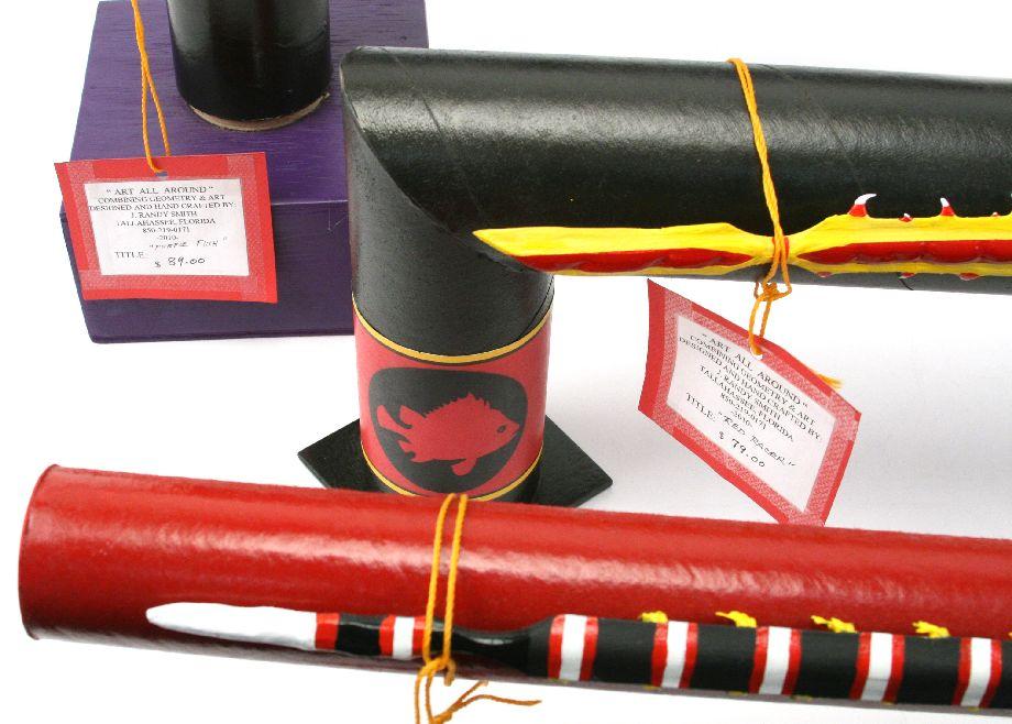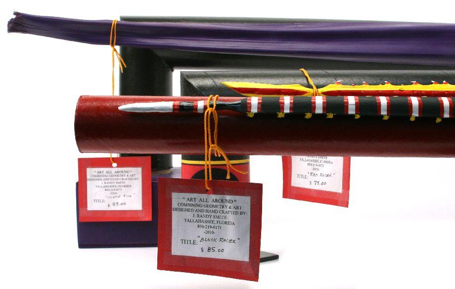 Grouping includes three sculptures made from found materials. All include description of series: Art All Around, combining geometry and art. Handcrafted by J. Randy Smith. Names of pieces: Purple Fish, Red Racer and Black Racer. Very good condition.