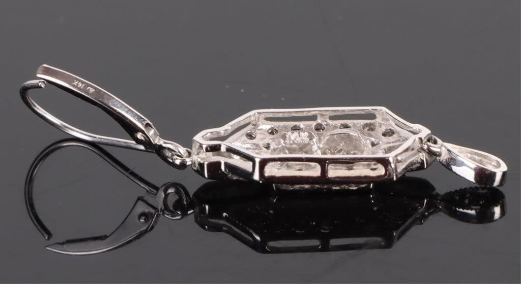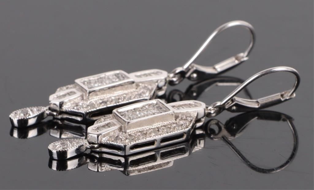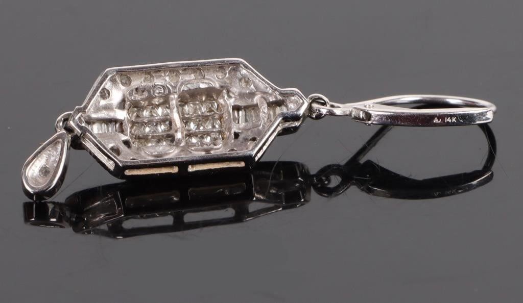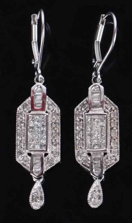 1.56CTW 14K white gold Art Deco diamond dangle earrings. The earrings have bands of princess cut diamonds lined with round cut diamonds. Atop the princess cut diamonds there are baguette diamonds.