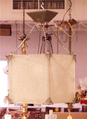 ART DECO - A French art glass hanging lamp. The cube shaped lamp formed by four opaline art glass panels, each relief decorated with leaves and berries. Supported with chromed metal wirework frame. Each panel with etched signature. On decorative chain hanger. 12" square. 22" long. 2500-3000