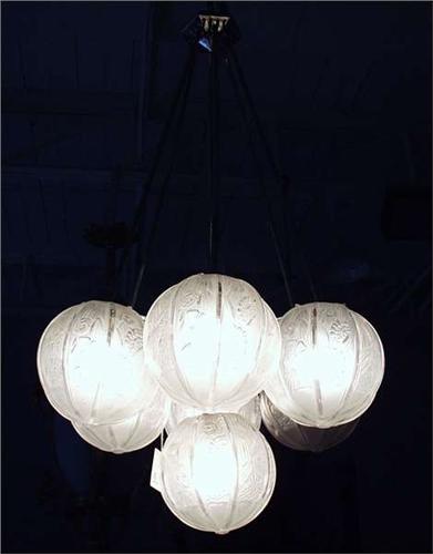 ART DECO - A French chromed metal and frosted art glass chandelier. The base formed by six metal rods suspended from a hexagonal decorative ceiling piece. With six side and one central globular frosted glass shade, each relief decorated with floral motifs. 40" long. Circa 1935. 5000-6000