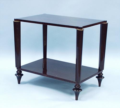 ART DECO - A French two-tier side table. Rectangular form, with four tapered supports and turned feet. 27 1/2" x 18 1/2", 23 1/2" high. Cca. 1935.
