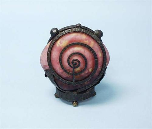 ART DECO - A French wrought iron mounted art glass night lamp in shape of a snail. Pink and yellow fused satin glass and hammered mounts. 5 1/2" high. Circa 1925. 4500-5000