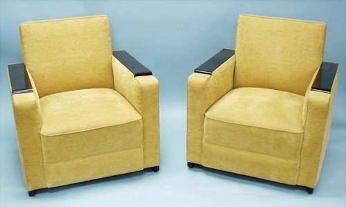 ART DECO - A black lacquer framed three piece salon set comprising a love seat and two fauteils. Recently reupholstered in gold velvet. French, circa 1935. 8000-10000