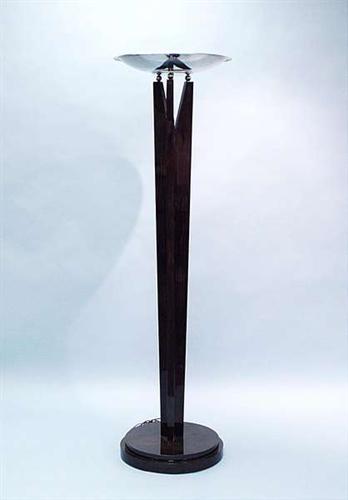ART DECO - A fine French macassar ebony torchere. The stem formed by three tapered panels raised on a circular base. With chromed metal fixture on top. 74" high, top 21" diameter. 7000-8000