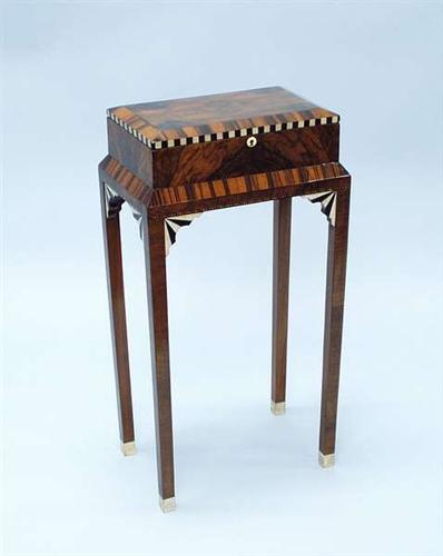 ART DECO - A fine sewing box raised on four straight legs. Inlaid with various woods. Upholstered interior. French. Circa 1925. 15" long, 10" wide and 28 1/2" high. 4000-5000