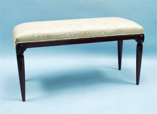 ART DECO - A good French mahogany framed window seat. On carved and turned legs, recently reupholstered in patterned beige silk. 40" long, 16" wide, 23" high. Circa 1935.