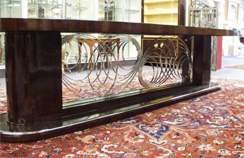 ART DECO - A highly important and large French rosewood dining room table with chromed bronze mounts. The large oval top is raised on a pair of pedestal supports connected by a pierce work bronze grille. Matching oval base with chromed rim. 140" long, 52" wide and 30 1/2" high. Circa 1930. 45000-55000