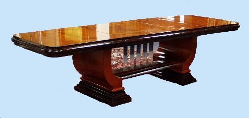 ART DECO - A large French palissander and fruitwood conference table. Base of geometric design. With four extension leaves. Circa 1930. 122" long, 38" wide, 31" high. Exceptional quality and workmanship.