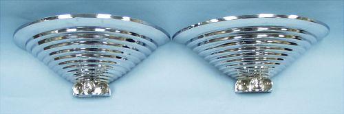 ART DECO - A pair of French chromed metal and crystal wall sconces. The shell shaped semi-circular fixture is mounted at the base with three crystal balls. 22" wide, 12" deep and 8" high.
