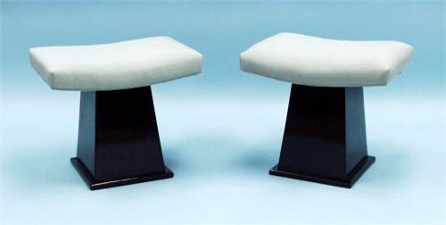 ART DECO - A pair of French fruitwood low benches with recently reupholstered grey silk pillow seats. 19" x 14". 17" high. Circa 1935.