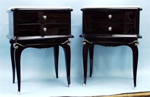 ART DECO - A pair of Jules Leleu design French polished lamp tables with ivory coloured lacquer tops. Each fitted with two drawers, crystal ball handles. Raised on cabriole legs mounted with chromed metal chutes and thimble sabots. 19" x 13 1/2", 26" high. Circa 1935.
