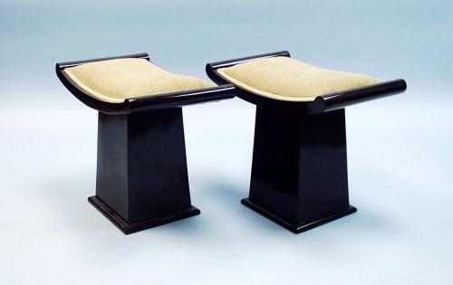 ART DECO - A pair of wood benches with beige upholstered seats. Recently restored. 23" wide, 14" deep and 18" high.