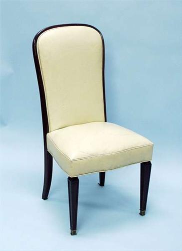 ART DECO - A set of 8 French mahogany framed side chairs with beige leather upholstery. Each with tapered legs mounted with gilt bronze thimble sabots. Circa 1935. 3500-4000