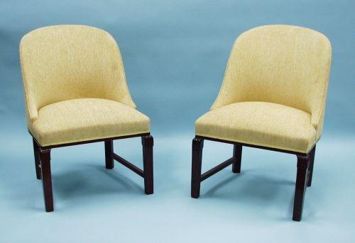 ART DECO - A set of six Chinese Chippendale inspired mahogany framed straight chairs with envelope backrests. Recently reupholstered in beige velvet. Circa 1935.
