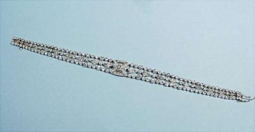 ART DECO - A very fine platinum and diamond bracelet. Designed as 3 lines of collet set diamonds around a central diamond set ornament. Circa 1935. 8000-10000