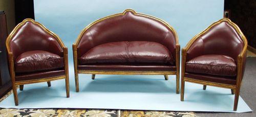 ART DECO - A very good Paul Follot design carved and turned gilt wood salon set comprising a loveseat and a pair of armchairs. The frames with grooved and tapered legs recently reupholstered in red leather. French, circa 1935.