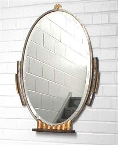 ART DECO - A very good oval form hammered steel wall mirror in the manner of Raymond Subes. Gilt border ornaments. 33" high. French, circa 1935. 3000-4000