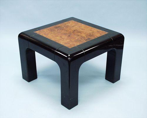 ART DECO - A very good pair of black lacquer finished wood end tables. Each square top with burl walnut insert in a copper frame. Top 25" square, 18" high. Circa 1935.