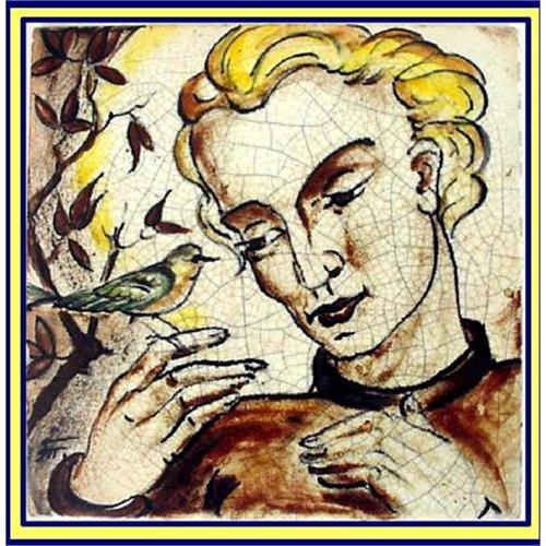 Hand painted tile made and signed by Art Deco Aesthetic Movement artist Fritz Hudler c1930.<BR>Measures 6inches square.<BR>Tile depicts a beautiful youth with curly golden hair, dressed in a brown roll-necked top - perhaps hinting at a monk or saint. Both hands raised. On one finger perches a little bird - quite unafraid. The mysterious downward look of the man may hint at mysticism and religion. Sensuous lips and long, tapering fingers, sinuous neck and gentle curving branch with delicate leaves. Glaze back and front of tile.<BR>Signed lower left FH. <BR>Condition is very good.