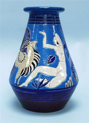ART DECO - ATELIER PRIMAVERA, LONGWY. A fine French faience vase. The conical shaped vessel is handpainted on crackled blue ground with nude women, birds and a goat. Hallmarked on underside. 13" high. Circa 1935. 3000-3500