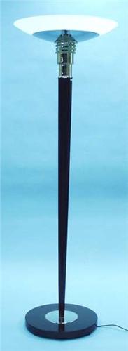 ART DECO - An attractive French macassar wood and chromed metal floor lamp. The tapered base is mounted with a metal band holding a saucer shaped frosted art glass shade. Shade 24" dia, 78" high. 4000-5000