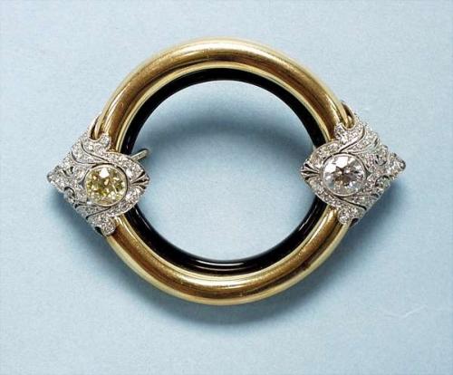 ART DECO - An important 18 kt. yellow gold, onyx and diamond brooch. Of circular form, bezel set with a fancy yellow European cut diamond, appx. 1.35 cts and a companion white European cut diamond, very fine colour, appx. 1.35 cts. Further decorated with diamond set filligree details. Total appx. diamond weight is appx. 4.30 cts. With gemologist's certificate. 25000-28000