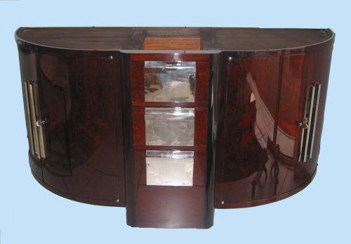 ART DECO. An important French chromed metal mounted polished fruitwood commode. The demi-lune shaped commode with closed shelved cupboards and a serpentine fronted vitrine section. Approx. 50" wide, 21" deep, 35" high.