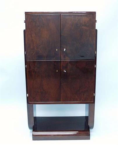 ART DECO - An unusual French macassar wood bar cabinet. Rectangular front with four way split doors and open cupboard. Interior with three wood shelves and closed conpartment with glazed drop front door. Recently restored. 29 1/2" wide, 18 1/2" deep, 55 1/2" high. Circa 1925. 12000-14000