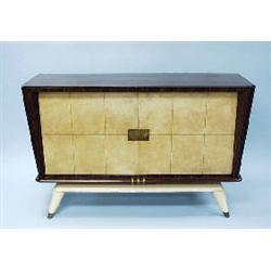 ART DECO - An unusual French macassar wood commode. Front with a pair of shagreen covered doors. Interior with shelved cupboard. With period gilt bronze mounting and hardware. 59" wide, 19" deep, 31 1/2" high. 10000-12000