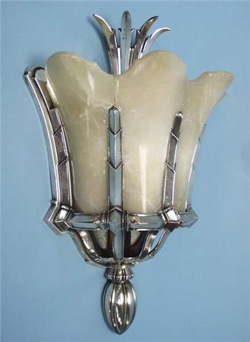 ART DECO - An unusual French silver patinated bronze and alabaster wall sconce. The torch shaped base has a floral finial mounted with four alabaster panels. Wired for electricity. 17" long. Circa 1935. 2500-3000