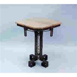 ART DECO - An unusual hammered and wrought steel salon table with marble top. The pierce worked columnar stem supporting a square shaped marble top with canted corners. Top 25 1/2" square, 32" high. French, circa 1925. 13000-15000