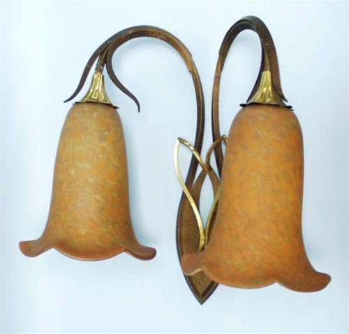 ART DECO - An unusual set of 6 bronze and art glass wall sconces. Each medallion shaped wall brackets with a pair of scroll armed fixtures. Fused art glass lily form shades. Appx. 24" long. American, cca. 1940. 1600-1800 EA.