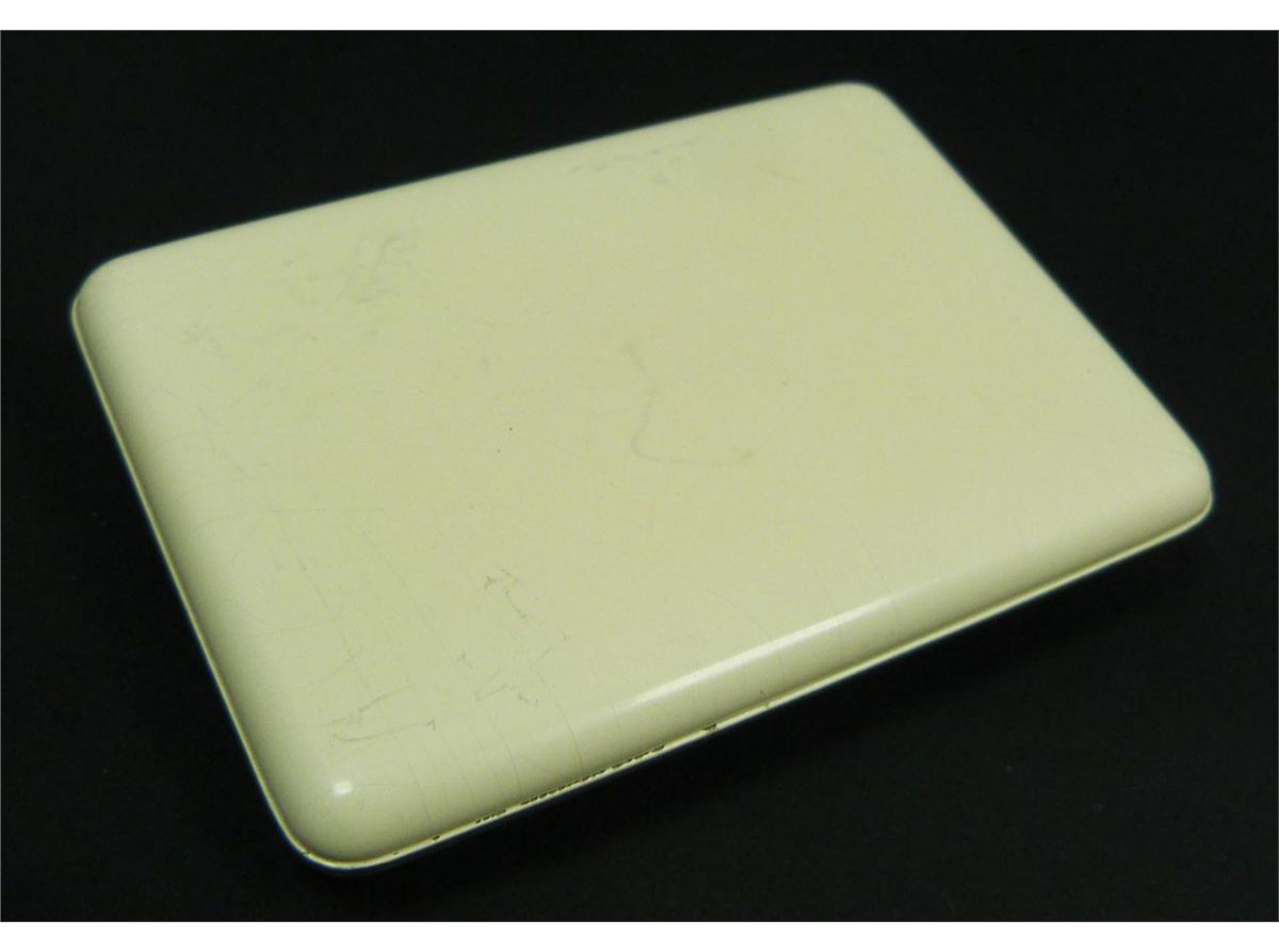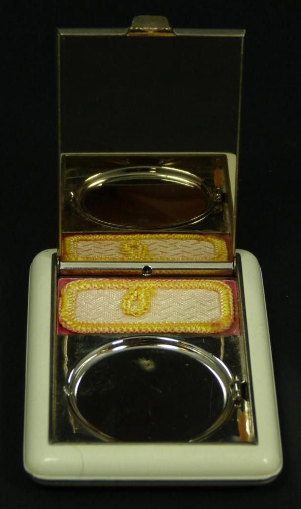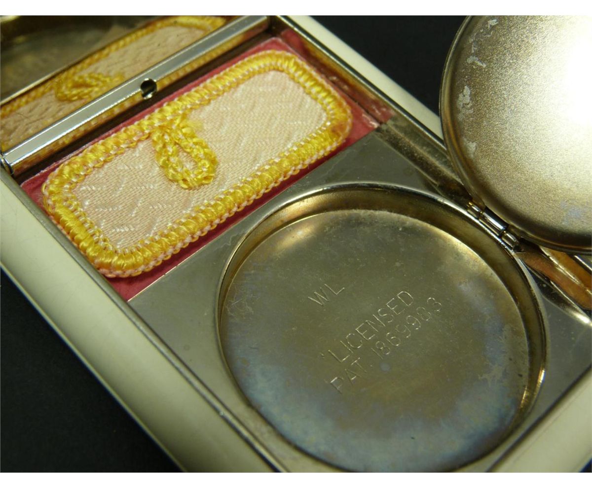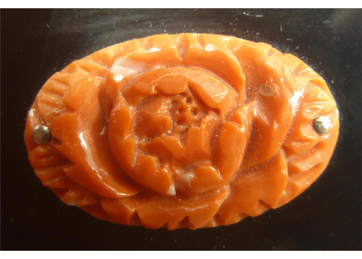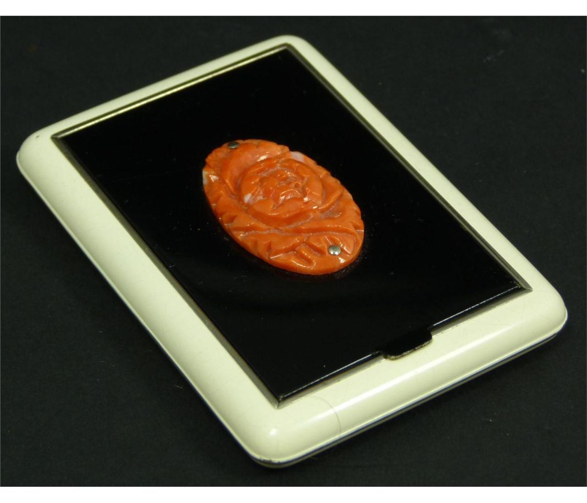 An art deco bakelite compact. Has applique carved red coral floral plaque to top. Silver tone interior with mirror. Measures 3" length x 2 1/4" width x 5/8" depth (7.6cm x 5.7cm). Total weight of 77 grams.