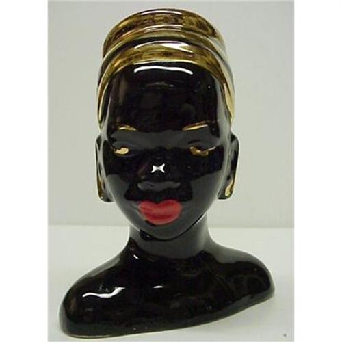 BEAUTIFUL HEAD VASE, DEPICTING GORGEOUS BLACK GIRL WITH GOLDEN TURBAN, FULL RED LIPS AND GOLDEN EYES AND EYEBROWS,THIS IS A QUALITY POTTERY PIECE WITH LUXURIOUS HIGH GLAZE. EXCELLENT CONDITION AND STANDS 6" high, US BUYER TO PAY 8.50 FOR SHIPPING PLUS INSURANCE.THANK YOU!