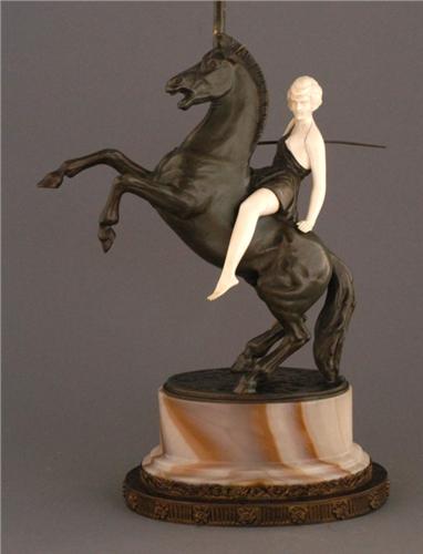 ART DECO BRONZE AND IVORY FIGURE ON A HORSE, unsigned 15 1/4" high including marble plinth and bronze only circa 1925 now fitted as lamp <BR>condition: some patina wear, solder from lamp shaft to horses ear, metal base added (not figured in dimensions)