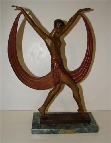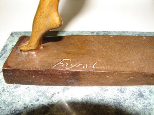 ART DECO BRONZE STATUE. Depicts a partially clothed female with outstretched arms. Statue is attached to marble base. Base has metal plate that reads “Nouveau Dancer/By Fayral”. Bronze base beneath statue is signed “Fayral”. 14.25” H
