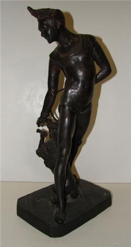 ART DECO BRONZE STATUE. Depicts a gentleman holding a hoop in ins left hand with a dog beneath his legs. Statue is attached to metal base. 15.25” H