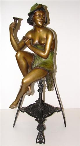 ART DECO BRONZE STATUE. Depicts a partially clothed seated maiden on a cast iron stool. Statue is signed illegibly on left buttocks. 30.25” H