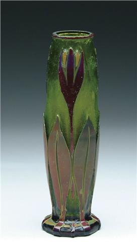 ART DECO CAMEO VASE. Wonderful cameo vase has deeply cut Art Deco design on stylized flowers and leaves in green, rust and red against an acid textured green background. Vase attributed to Harrack. SIZE: 8 in. t. CONDITION: Very good to excellent. 5-61102