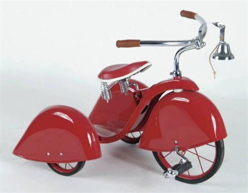 ART DECO CHILDS TRICYCLE. Professionally restored in red with Airflow type wheel covers at front and rear, padded vinyl seat, curved handlebars, red spoked wheels with black rubber tires, and nickel plated bell. SIZE: 30" l. x19" w. x 24" h. CONDITION: Near excellent restored condition. 1-5702 AT