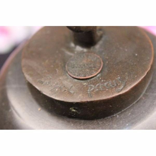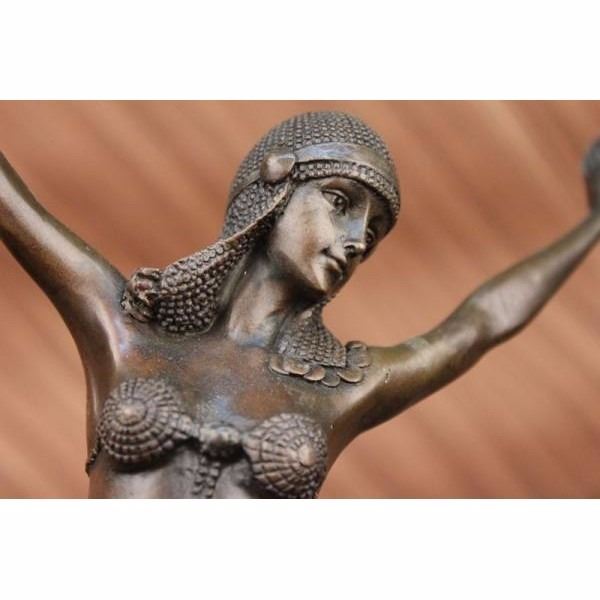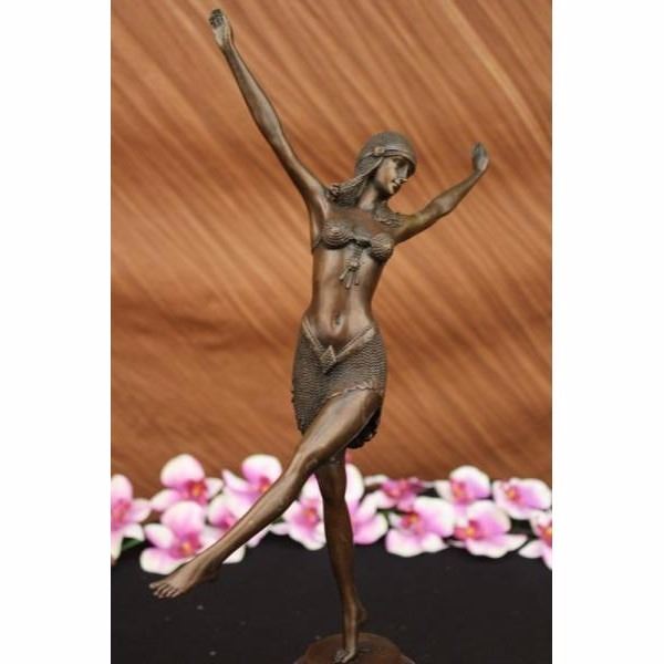 With grace, agility and flexibility, this vibrant dancer is light onher toes. She jovially kicks a long lean leg high up as she prances.Her beaded mini skirt jiggles behind her as she shakes her hips to the music. She also wears a matching bikini top and headdress. This nimble dancer is in a brown patina. She is mounted high on a marble base, which is signed by the artist D.H. Chiparus. 100% handmade and detailed, she was cast using the "Lost Wax Method."Demetre Haralamb Chiparus (also known as Dumitru Chip?ru?; 16September 1886, Dorohoi, Romania - 22 January 1947, Paris, France) was a Romanian Art Deco era sculptor who lived and worked in Paris. He was born in Romania, the son of Haralamb and Saveta. In 1909 he went to Italy, where he attended the classes of Italian sculptor Raffaello Romanelli. In 1912 he traveled to Paris to attend the Ecole des Beaux Artsto pursue his art at the classes of Antonin Mercie and Jean Boucher. Demetre Chiparus died in 1947 and was buried in Bagneux cemetery, just south of Paris Condition: This sculpture is in perfect condition. Bronze Dimensions with Marble Base:Height 18" X Width 13" Marble Dimensions: Diameter 5" . Height without base: 15" Weight : 10 LBS Inventory: 57B5934575 .