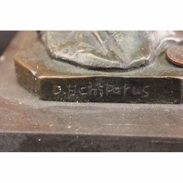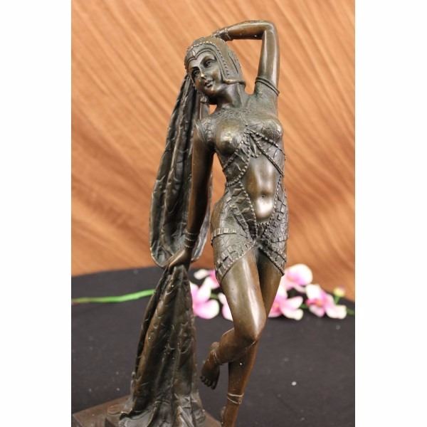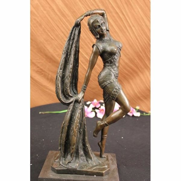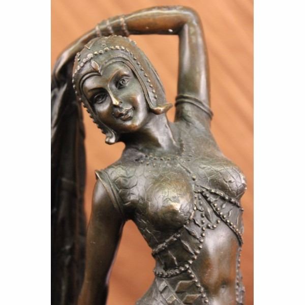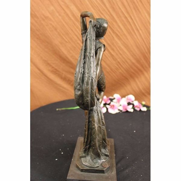 A graceful Art Deco Bronze Dancer on Marble base, Artist signed by D.H. Chiparus. This Lady Dancer wearing a long dress in a beautiful variation, wearing also a nice cap - an absolute worth seeing exhibit. The result is a high impression bronze dancer. Sculpture, stand on right tiptoe, below her, a round formed multi shift marble base. Bronze cast, finest museum quality. Artist signed by D.H. Chiparus. In comparison with the original, this Object is so filigran as possible. That's amazing! It's maden and used to display in a exhibition or for collectors using.Our own production control, saves the top quality of this beautiful bronze.True to the Art Deco period, this sculpture is by Romanian-born and Paris-trained artist Demetre H. Chiparus (1886-1947). Demetre Chiparus was originally born in Romania and exhibited his bronze works in high class galleries in Paris. His figurines and sculptures were based on the ballet and the theatre. His statues were always exquisitely detailed. You can find his name at the base of the sculpture. This Bronze sculpture is handmade and was casted using the “Lost Wax Methodâ€. Condition: This sculpture is in a very good condition. Bronze Dimensions with Marble Base:Height 17" x Width 8" Marble Dimensions: 7 1/2" X 5". Height without base: 16" Weight : 14 LBS Inventory:26Y3556562