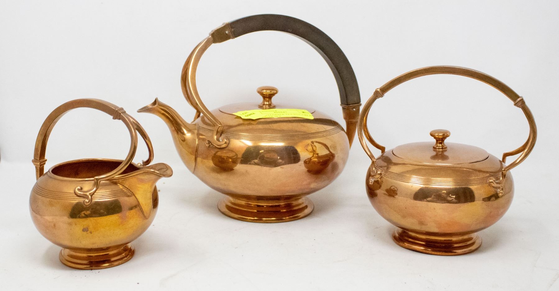 ART DECO COPPER TEA POT CREAM AND SUGAR SET
