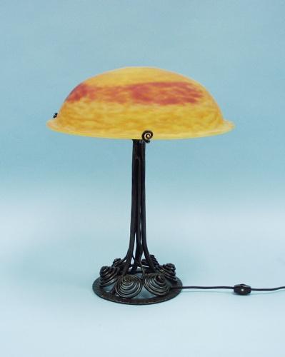 ART DECO - DAUM, NANCY. A hand hammered wrought iron table lamp with scroll decoration and a yellow-orange fused art glass shade. Signed. 17" high, 14" diameter. French, circa 1935.