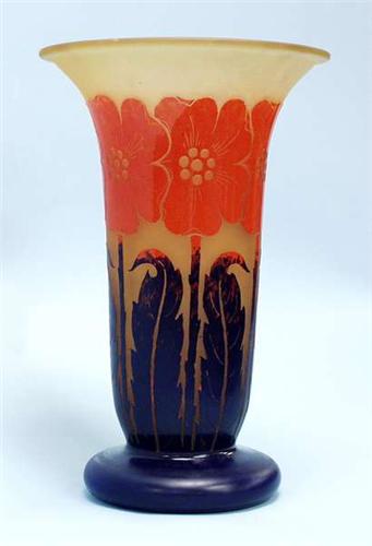 ART DECO - DEGUE, FRANCE. A large cameo glass vase. The floriform vessel with beige and blue opaline ground decorated in cameo with red poppies and blue leaves. Intaglio signature on circular base. 15 1/2" high. Circa 1935. 3000-3500