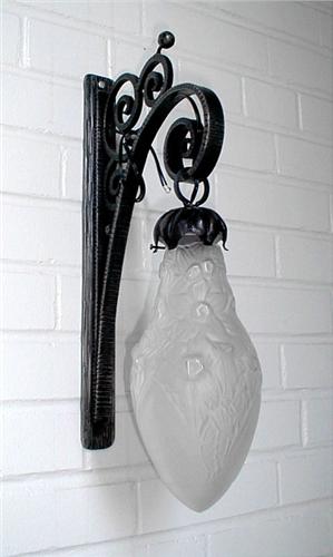 ART DECO - DELATTE, NANCY. A pair of frosted art glass wall sconces with period wrought iron mountings. Circa 1930. Signed in relief. 17"long.