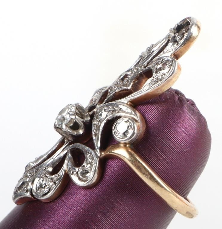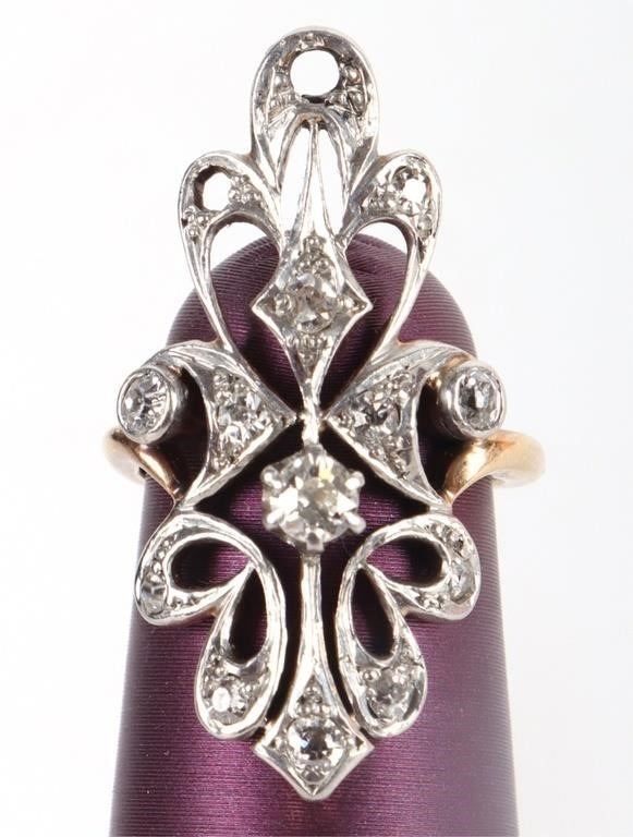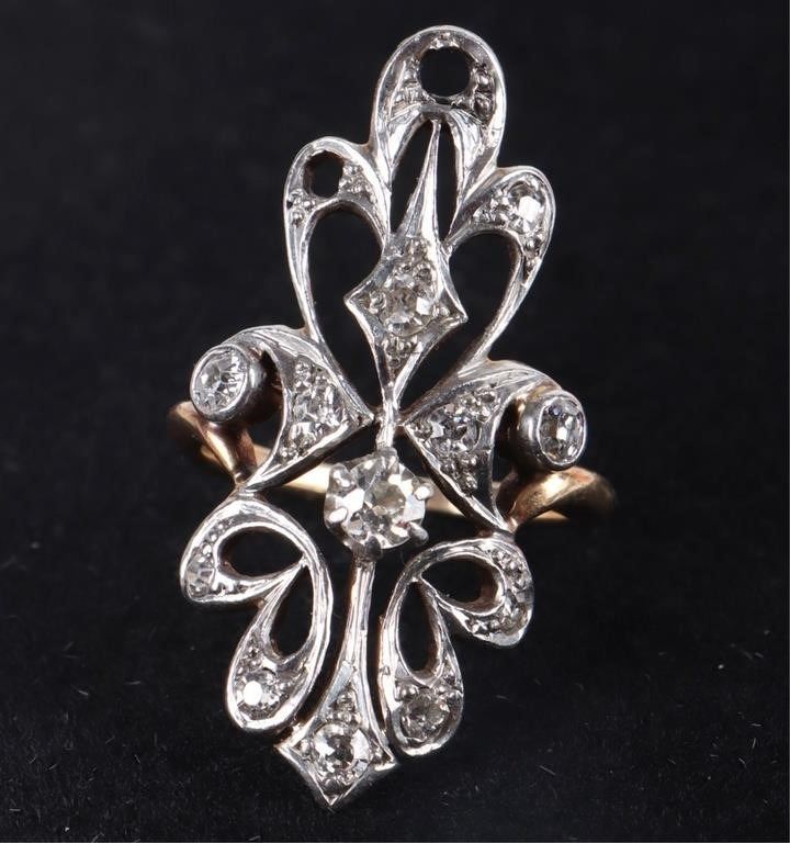 Art Deco diamond 14K white and yellow gold ladies ring with one 0.15CT round diamond, two 0.08CT round diamond, two 0.04CT round diamonds, seven 0.02CT round diamonds.