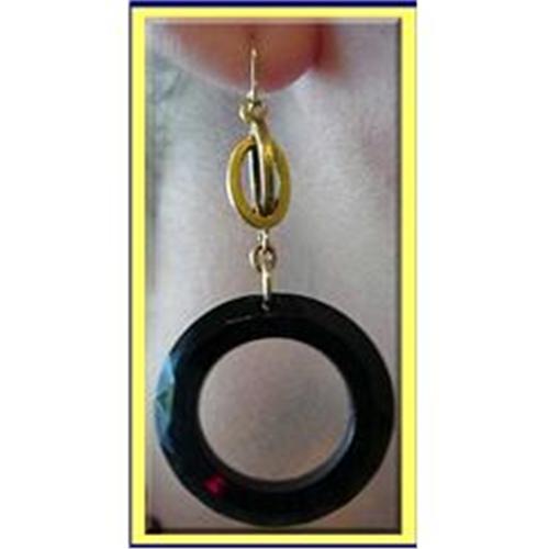 Black faceted bakelite in a ring dangle from interlocking textured gold oval loops. Gold is not