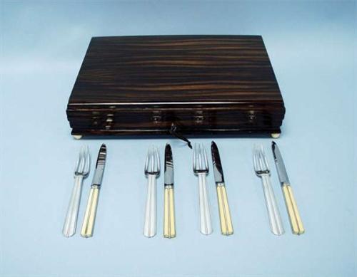 ART DECO - EMILE PUIFORCAT. "Biarritz" - A 24 piece French sterling silver fruit set comprising of 12 forks and 12 knives with fluted ivory inlaid handles and stainless steel blades. Each piece hallmarked and with maker's mark. In maccassar wood carrying case. Illustrated in F. de Bonneville: "Puiforcat", page 249. 10000-12000