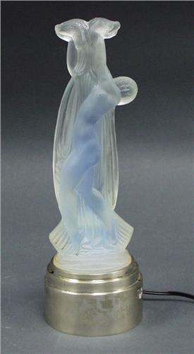 ART DECO - ETLING, FRANCE. A well detailed opaline glass sculpture of a nude. On stepped chromed metal base, wired. Signed. 11 1/2" high. Circa 1935.